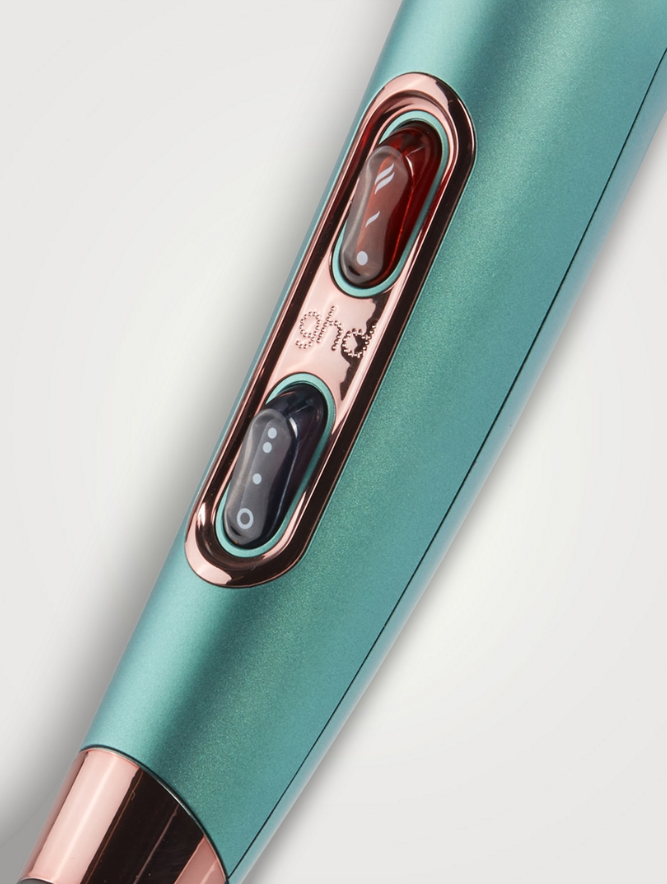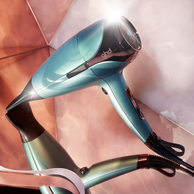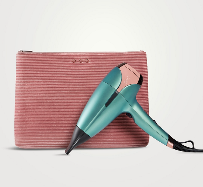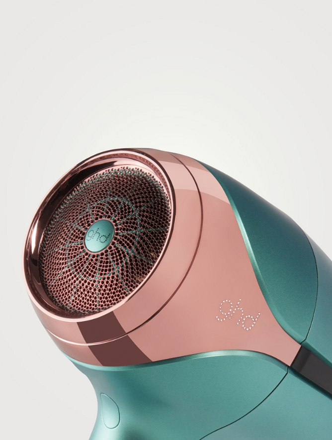 GHD Helios Hair Dryer, coated in an ethereal alluring jade and finished with metallic pink accents, all wrapped up in a coordinating wash bag. The GHD Helios sets a new standard with its lightweight build and enhanced speed, offering unparalleled precision and styling control. The Aeroprecis® technology, merges internal aerodynamic design with a custom contoured nozzle, culminating in focused temperature and airflow distribution. This design creates effortless styling, providing you with precise control and improved hair alignment. Experience the GHD Helios hair dryer's powerful performance and compelling styling results. Utilizing cutting-edge ionic technology for minimizing frizz and flyaways, the GHD Helios® hairdryer provides a flawless outcome, with smooth and shiny results. With its adjustable temperature and speed settings, you have the power to create any desired style, bringing a professional-level blow-dry experience right to your fingertips. With your styling experience in mind, GHD Helios boasts an optimised weight distribution and ergonomic balance for seamless, effortless styling.